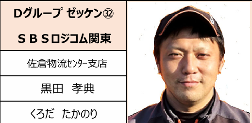 誤記載の内容は、裏面「第8回SBSグループドライバーコンテストin姉崎」の「4トンの部出場選手紹介」の「佐倉物流センター支店 黒田孝典 運転手の写真と紹介文」であり、正しい紹介文は『余裕で優勝できると思います』であり写真は以下の通りとなります。